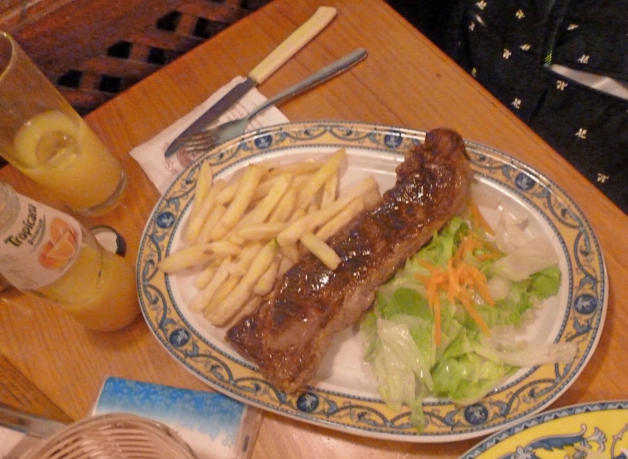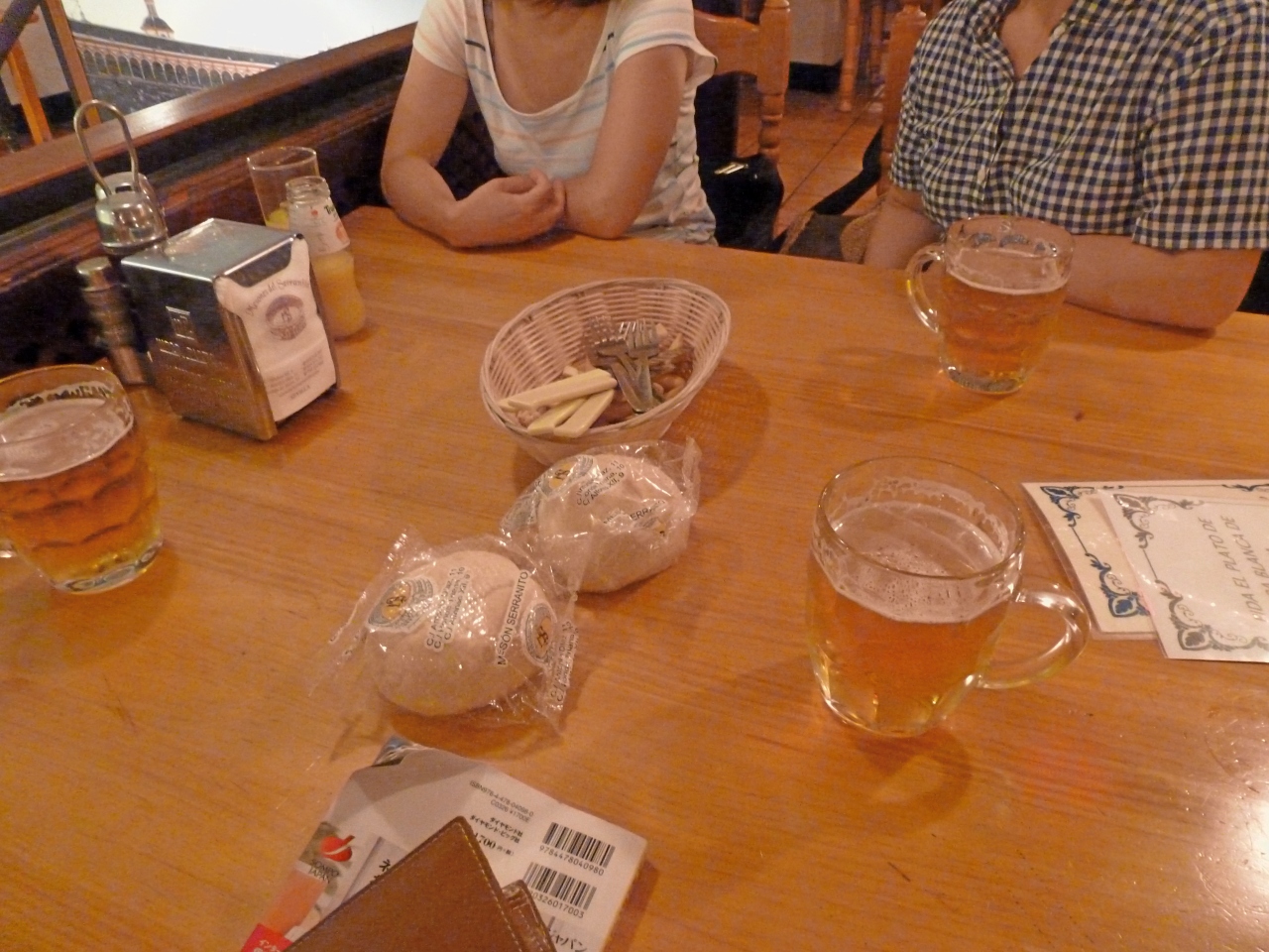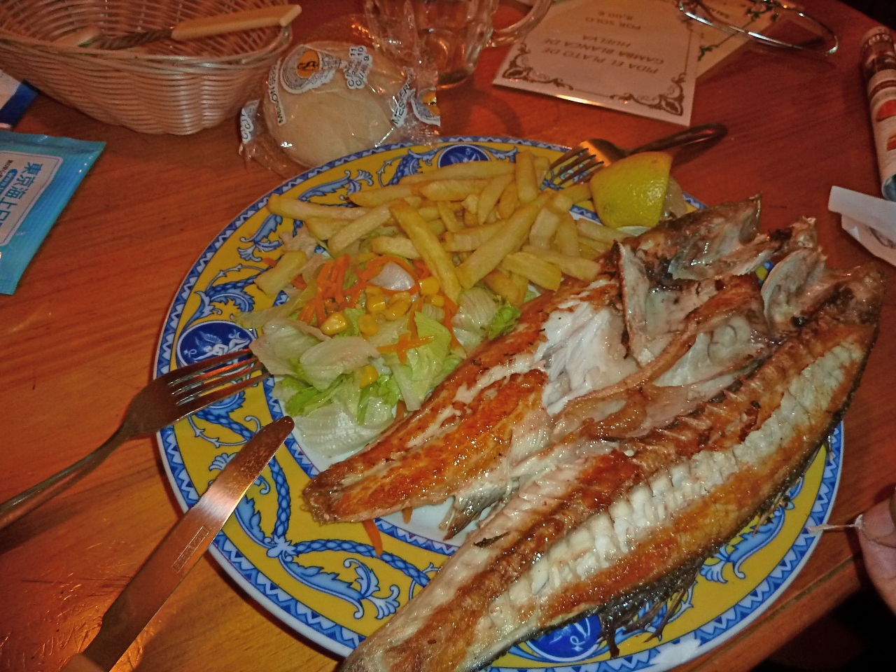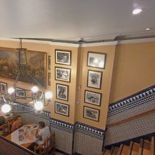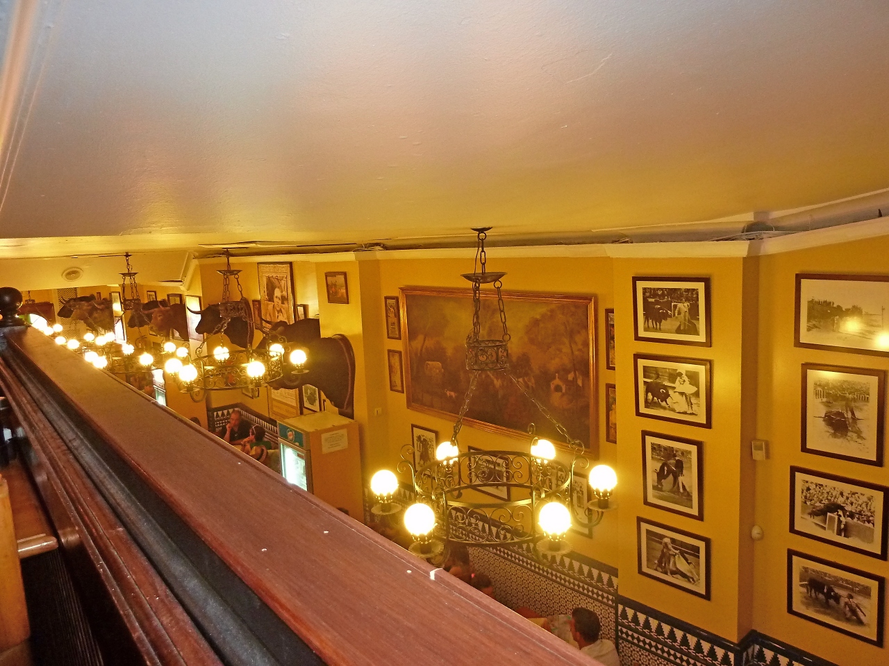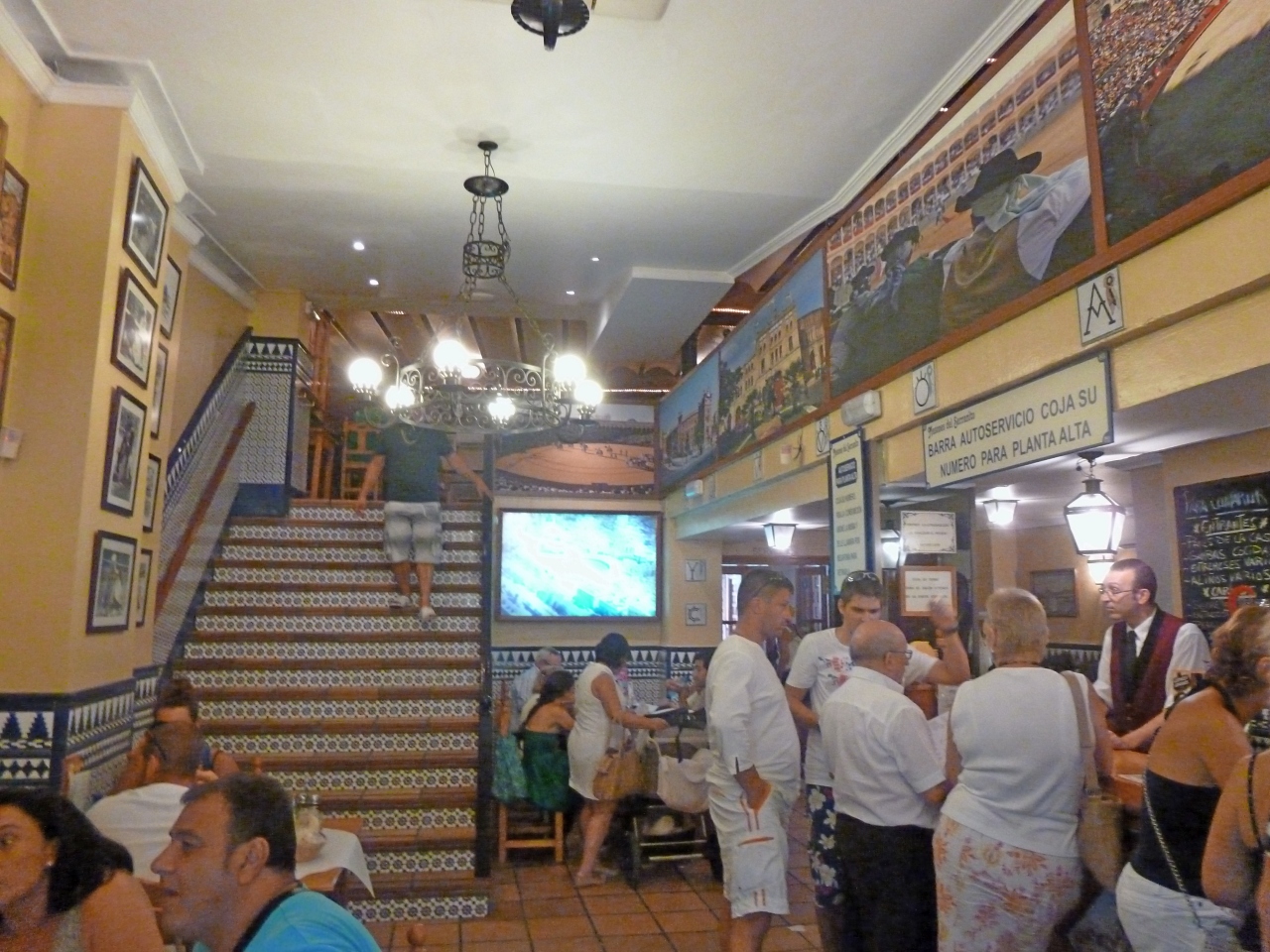 店の中は人でごった返している.いかにも庶民的雰囲気.カウンターでメニューを見ながら頼む.一応英語のメニューあるがレジで並んでいるので,選んでいる余裕はあまりない.料金もここで支払う.あとで食事ができたらカウンターまで自分で取りに来るセルフサービス.その時に名前で呼ばれるのだが,日本人の名前は難しく,かってに「JUAO」という名前にするといわれた. 大きなマイクで「Juao]といわれてから取りに行った.英語は通じる.ビール,料理占めて4人で61.2ユーロ.まあまあの値段かな..決して安くはないが,高くはない闘牛場のそば,そのため闘牛で装飾..にぎやかで雑踏の中で食べてるような雰囲気には閉口したが,昼食として気軽に食べるには良い店だし,スペインの庶民のエネルギーをもらうには良い店だ.