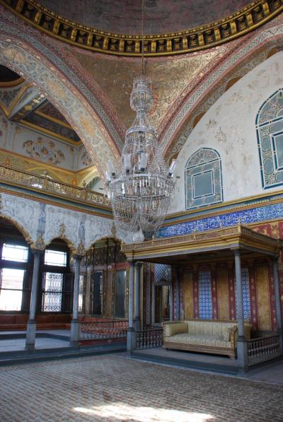 「トプカプ宮殿でまず最初に訪れるべし!」、とのセオリー通り、朝1でハレムに行きました。 ここは、宮殿の入場料20TLとは別に、15TLが必要です。どの部屋も豪華で素晴らしいのですが、中でも1番豪華だったのが、スルタンの大広間「皇帝の間」!イスラム美術と西洋美術がMIXされた感じなのに、うまく調和し、まとまっている感じが素敵でした。入場した頃はガラガラでしたが、出る頃にはかなりの行列になっていたので、やはりセオリー通り朝1が鉄則のようです。