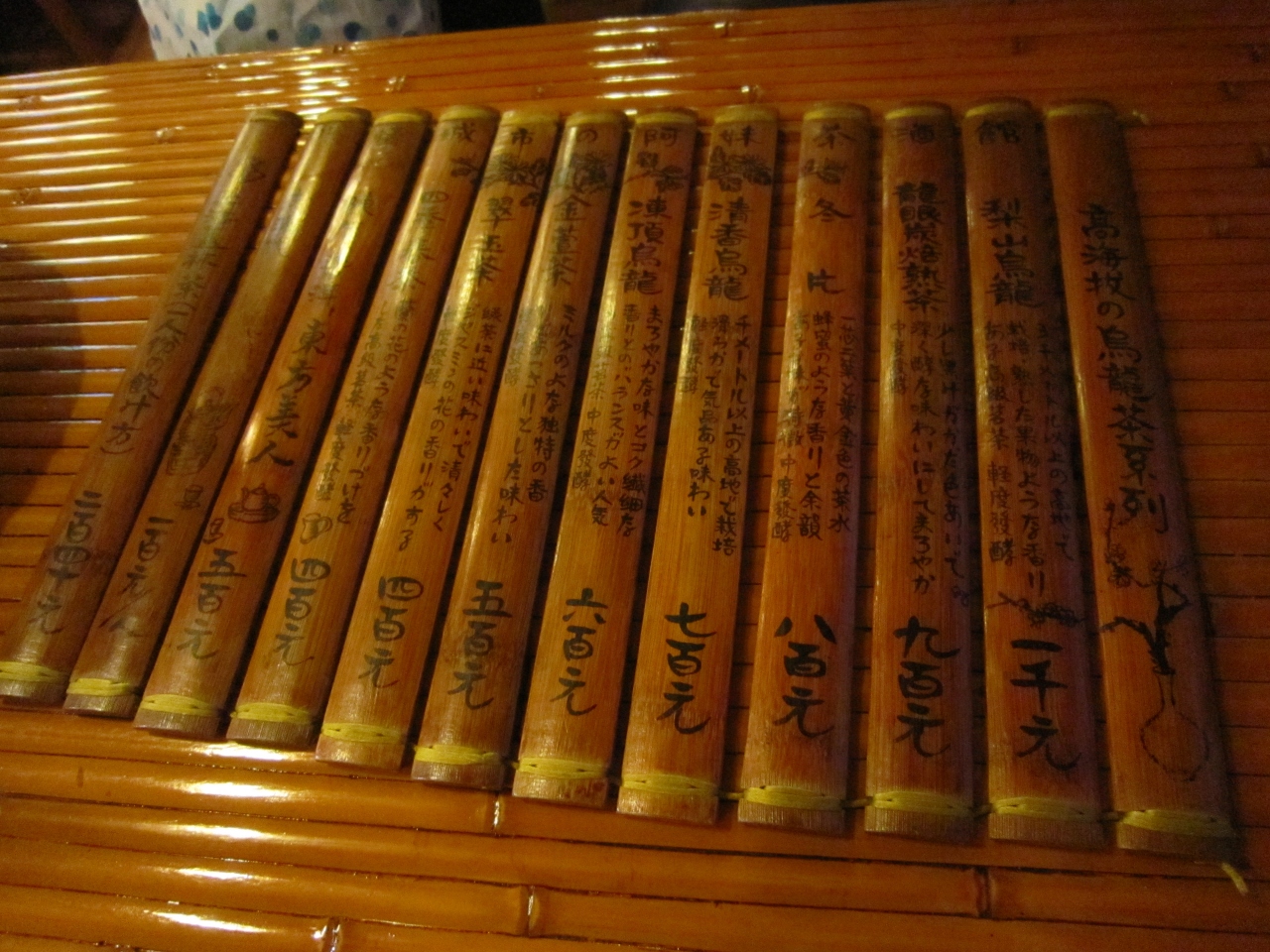 一人100元のお湯代と好きなお茶葉(400元~1000元)とお茶菓子を選びます。