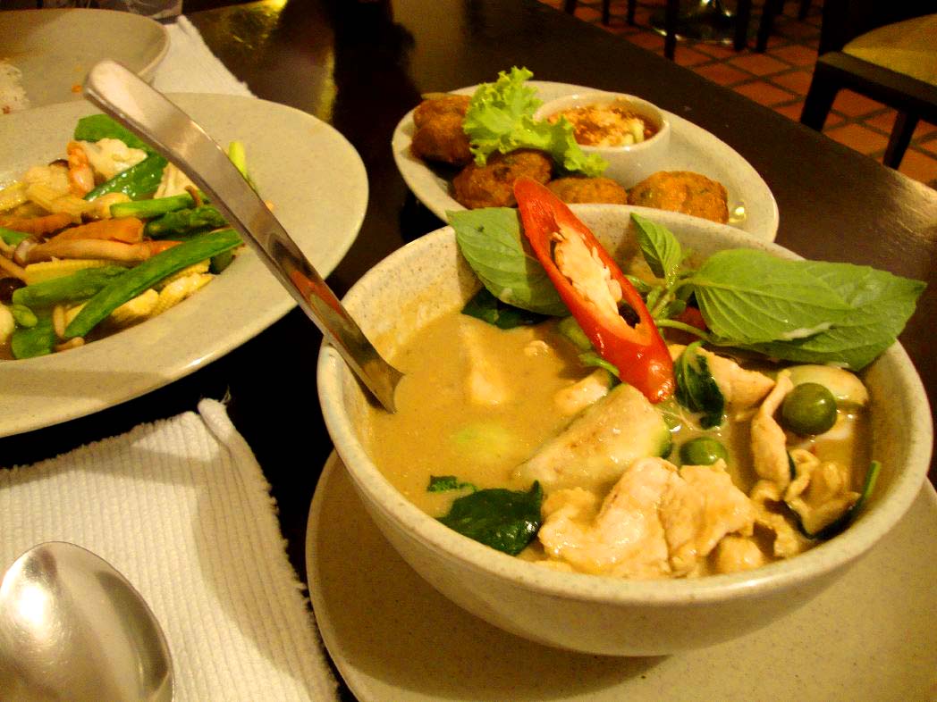 食事はどれもおいしかったのですが、グリーンカレーも辛さがあまりなく、炒め物もタイ独特の香辛料の匂いも弱めでした。