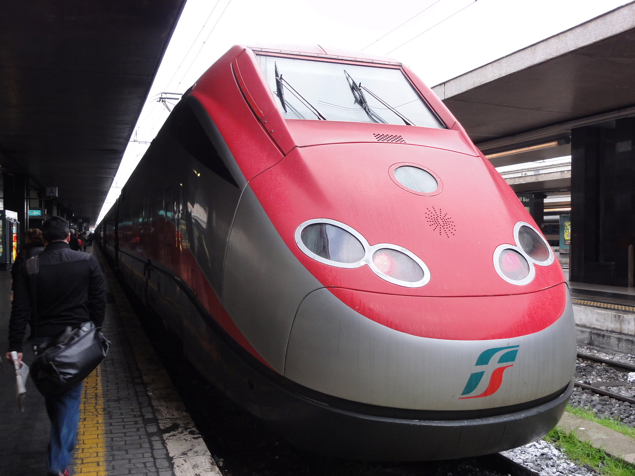 ローマ滞在中、ポンペイ遺跡の見学にローマ~ナポリの往復にユーロスターを使いました。所要時間は約1時間、一般の列車と同じ線路を走り、最高時速は300KM。社内に走っている場所の地図と速度が表示されていました。300KMになると表示が変わりますが、数回しかなくまた1~2分しか続きませんでした。