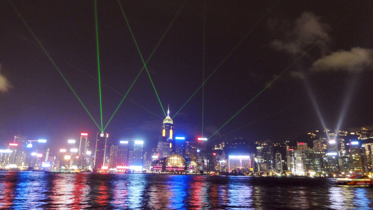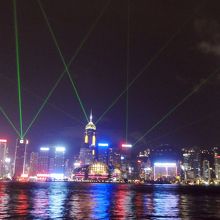 中国語の掛け声、間が抜けたような音楽に合わせて、対岸のビルが返事をするようにレーザ光を発して始まりました。一度は見ておくと良いとおもいます。