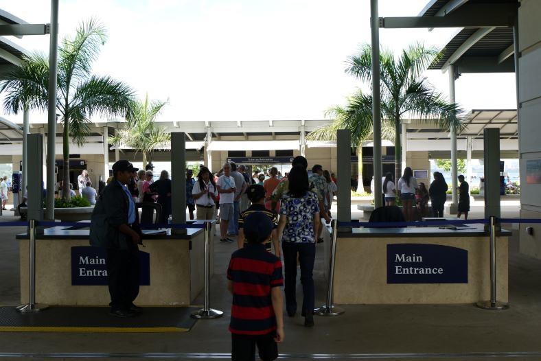 アリゾナ記念館入り口にはセキュリティーゲートがあって、持物のチェックをしています。