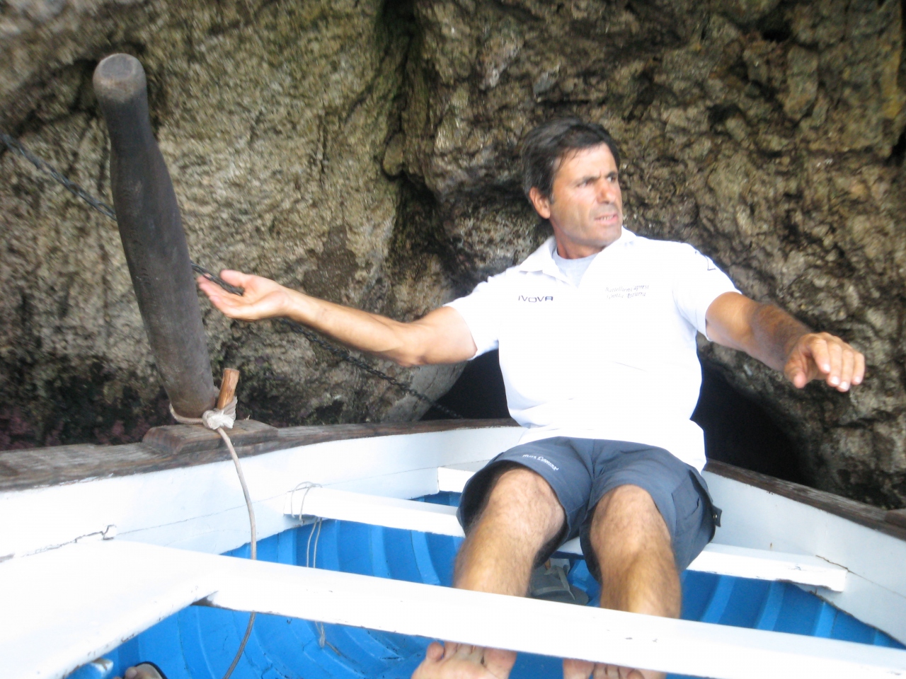 ベルベッロ港から朝7時10分発の高速船で45分でカプリ島へ行き、タクシーで青の洞窟の手前に8時40分に着きました。タクシーは片道40~50ユーロならまともだと思います。(私たちは往復で80ユーロで承諾したところ、復路の最後で待ち時間料金もと120請求されましたが、80渡して「バイバイ」と言って去り、追われませんでした。) バスでも9時前に着けば待ち時間ゼロと思われます。なお、チップを20ユーロ渡して、4周してもらいました。