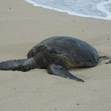 ホヌは保護されていますので砂浜に上がってくると係員がロープをはってロープの中には入れませんが割合間近で見る事ができます。ワカメを食べたりお昼寝したりしているのを見ると心がなごみます。