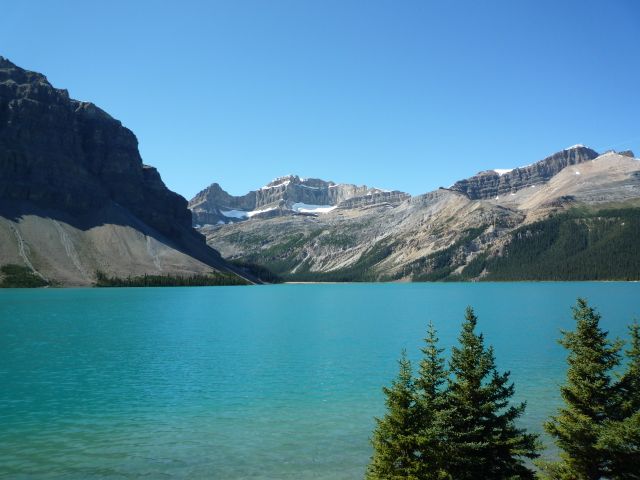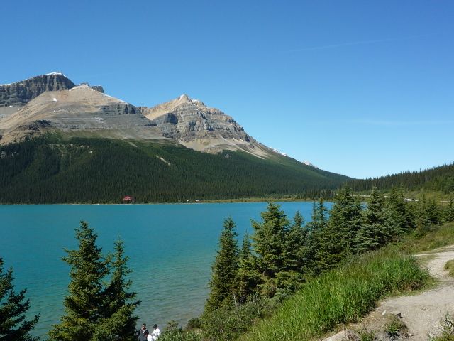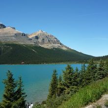 バンフからジャスパーに向かって走ると、クロウフット氷河の少し先、道脇にあります。ひときわエメラルドグリーンの水色が鮮やかで写真映えします。氷河によって削られた土が堆積して、このような水色になるそうです。