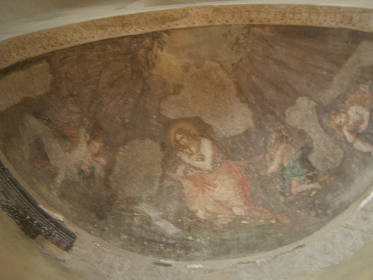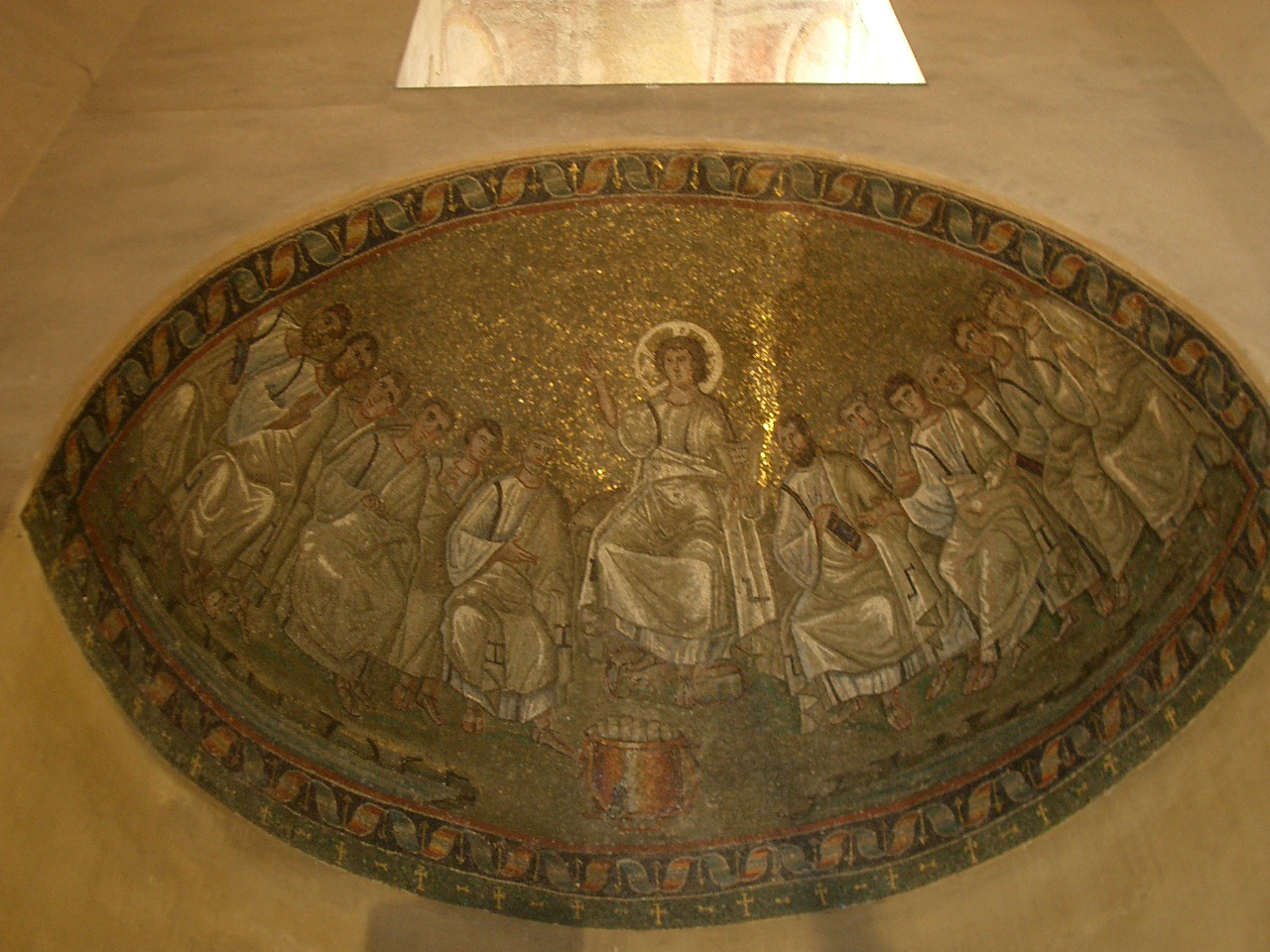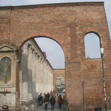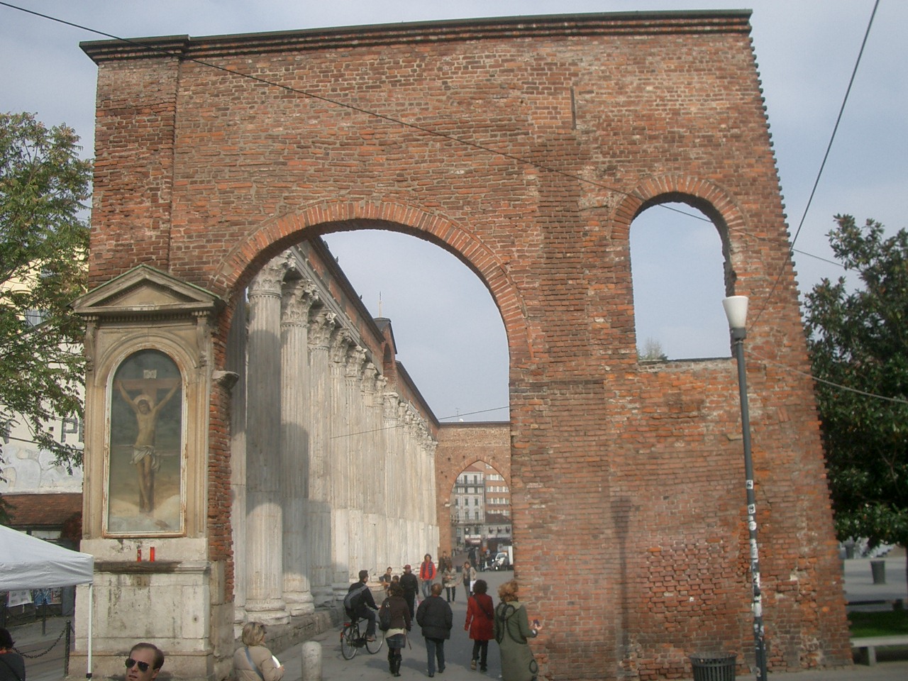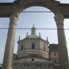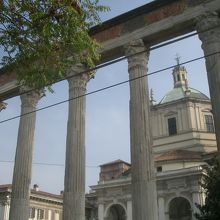 建物正面に古代ローマの列柱があるサン・ロレンツォ・マッジョーレ教会。内部に聖アクィリーノ礼拝堂がありその壁・天井に描かれた黄金のモザイックは必見です。ヴェネチュアのトルチェッロ島の黄金のモザイックに肩を並べる心を打つ作品です。ぜひ、ぜひいらしてください。