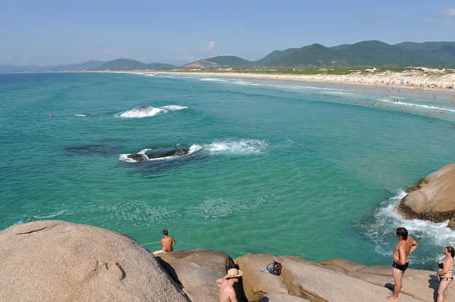 薄黄色の粒子の細かい砂浜とエメラルドグリーンでありながら透き通るような海水とのコントラストが眩しいフロリアノポリス一番の人気ビーチと言っても過言ではない。岩場から海岸を見渡せば、この海岸の魅力が一目瞭然。