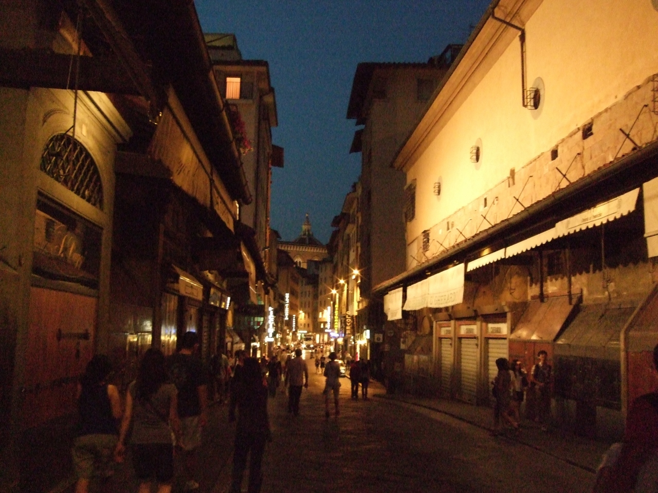 昼間のヴェキオ橋は、多くの買い物客でにぎわっていますが、店が閉まった夜は周りが暗くなるので電灯が橋をライトアップをしているようになります。人も少なく、静けさの中で橋を渡ったり、夜景を撮影したりすると昼間とは違った雰囲気が味わえます。(8月は、10時頃でも危険な雰囲気は感じませんでした。)