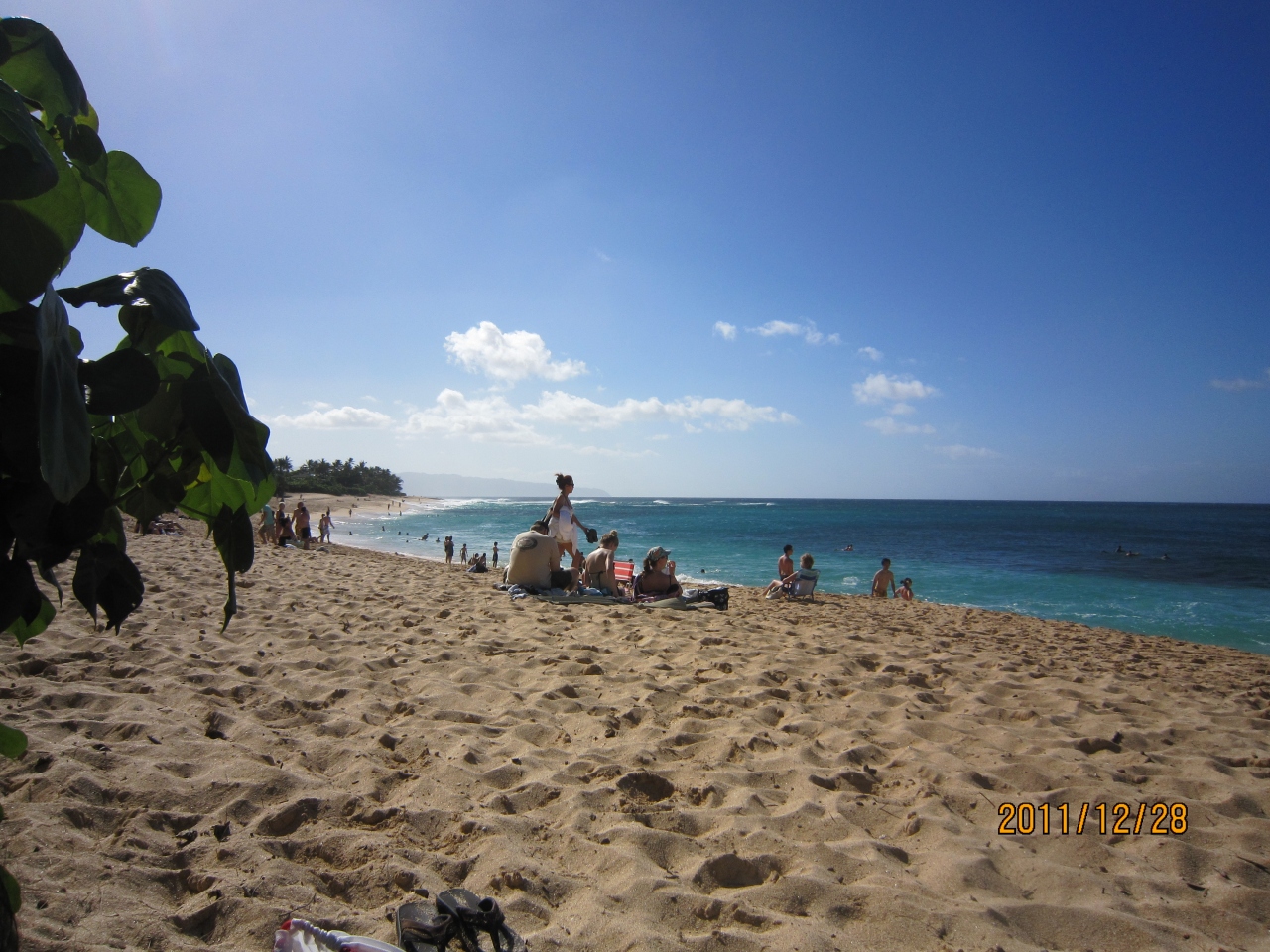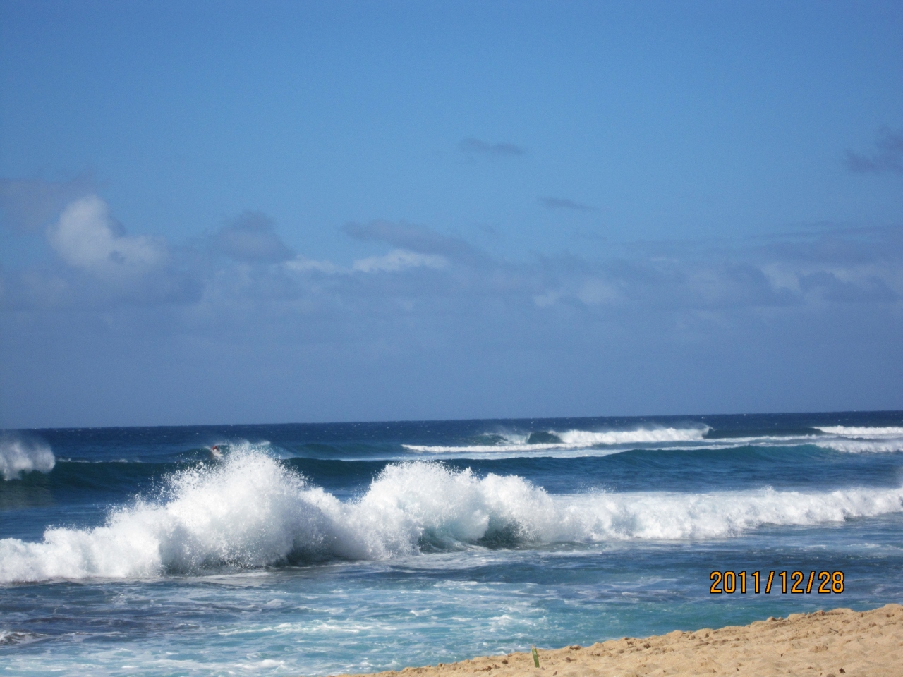 レンタカーでノースショアドライブ中に立ち寄った。道路沿いにたくさん車が停めてありあいたときを狙ってすかさず入れる。波が高く沖の遠いところにサーファーの姿が見える。泳いでいる人もあり、娘のハズも早速水中に入るが水は冷たく流れが速くて流されると。