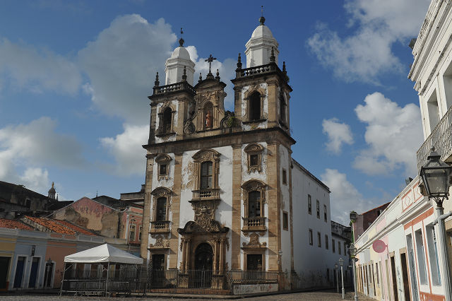 カウモ教会からダンタス・バヘット大通りを跨いだ所にあるサン・ペドロ・ドス・クレーリゴス大聖堂。土日は内部を見る事ができないので、平日に行く必要があるが、外部を見るだけでも十分見応えがある。周辺にはカラフルな店舗が建ち並ぶ。