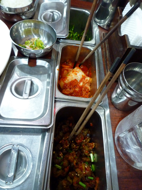 キムチやニラキムチや日本のキューリのキューちゃんのようなキムチ、アミの塩辛などを入れてごはんといただきます。