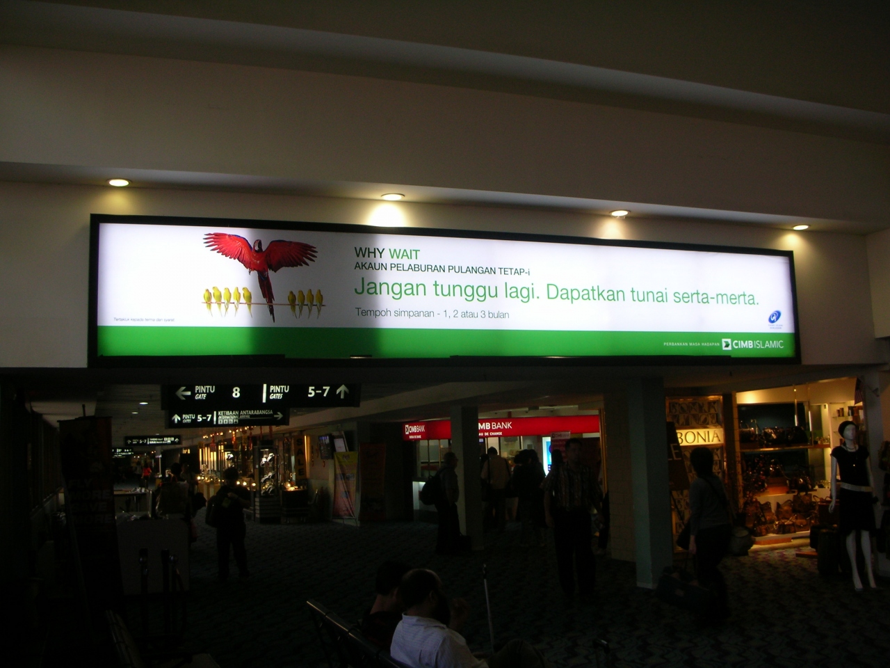 空港玄関口、チェックインカウンター等は、島の空港にしては広いなぁ、と思ったのですが、チェックインをして中に入ると、天井は低く、薄暗い感じがしました。クアラルンプール行きの飛行機が遅れてしまい、搭乗口付近は、椅子が足りなくなり、座れない人であふれていました。