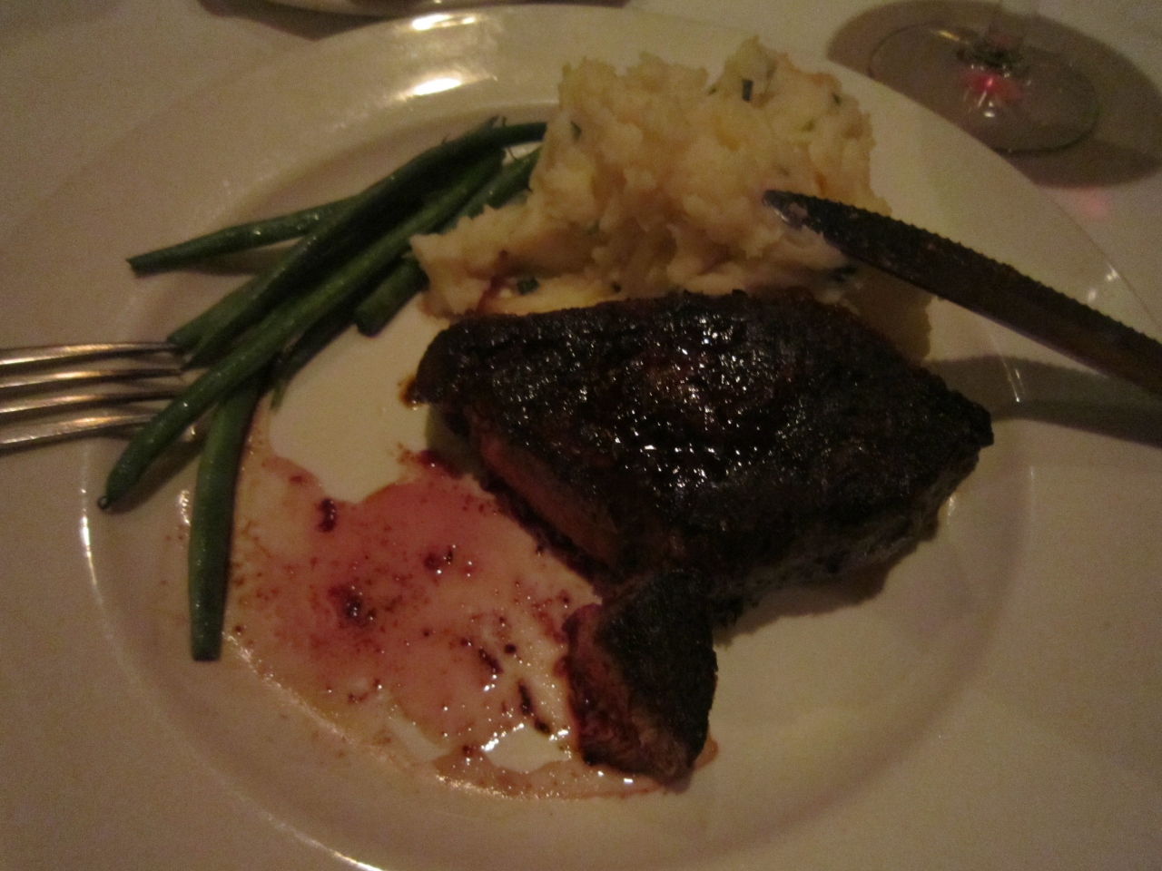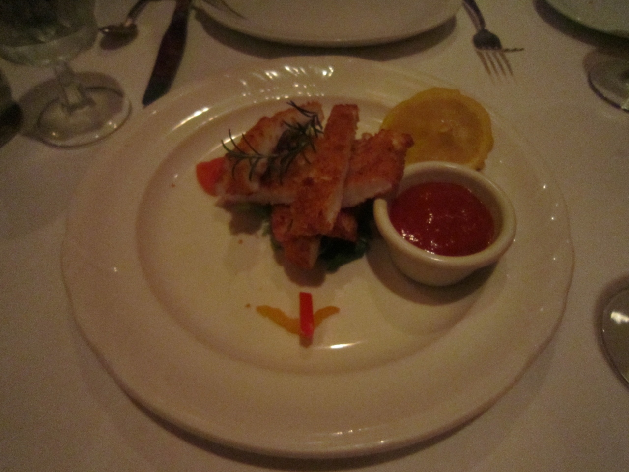 席に着くとすぐにサービスのチーズブレッドが来て、あつあつをいただきました。これは白ワインに合って最高でした。アペタイザーにカラマリ、ガーデンサラダをオーダーしました。ガーデンサラダは主人とシェアすると伝えたら、きれいに取り分けてサーブしてくれました。お肉に合うおススメの赤ワインを!とお願いすると、ちょうど良い値段の料理にピッタリ合うワインを用意してくれました。美味しかったです。