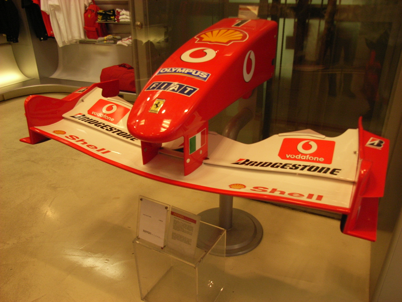 まず入り口には昔と現在の実車のF1カーが飾られており、壁には歴代のフェラーリチャンピオンの写真が飾られています。また、そのほかにも様々なパーツ等がおかれておりました。その中でも目を引いたのは、F1のフロントウィングとステアリングで、イタリア語なので読めませんでしたが、前に値段のようなものが書いてあり、もしかしたら売り物なのかもしれません(私には到底手の出ないお値段ですが…)。