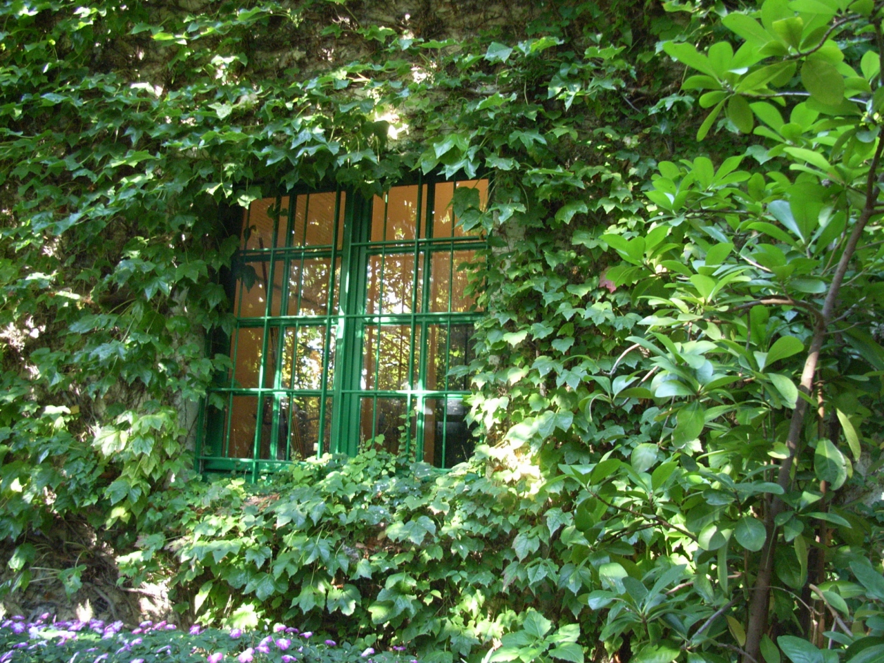 家は見事なまでの蔦で覆われ、緑一色ですが、家の前の庭園には色とりどりの花が咲き乱れ、見事な対比をなしています。