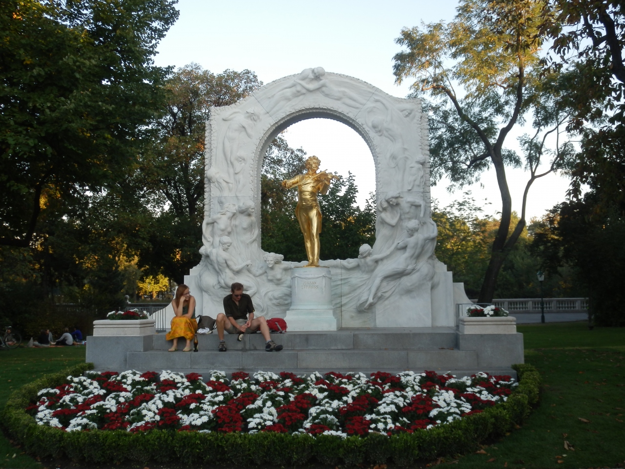 ウィーンの初の市立公園の中には多くの彫刻がある。中でも目をひくのがヨハン・シュトラウス2世である。バイオリンを奏でる金ぴかのこの像はひときわめだつ。そのほかにも、シューベルト、ブルックナーなどがありのんびり庭園を散策するのにもよい。