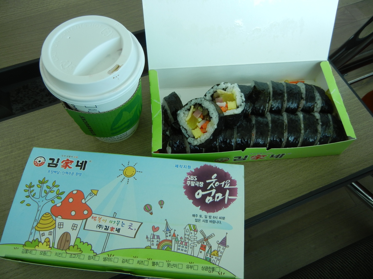 韓国のり巻き「キンパ」が大好きで、ソウルへ行ったら必ず食べています。スーパーのお惣菜コーナーにもありますが、正直、あまり美味しくないのでやっぱり専門店で・・・。このキムガネはあちこちに支店があるので立ち寄りやすく、価格も手ごろなのです。「持ち帰りにしてもらって宿泊先で食べる」のがいつものパターン。注文すると、アジュマ(おばちゃん)がパパッとその場でキンパを巻いてくれます。その手際のよさに、また感動~(^^)