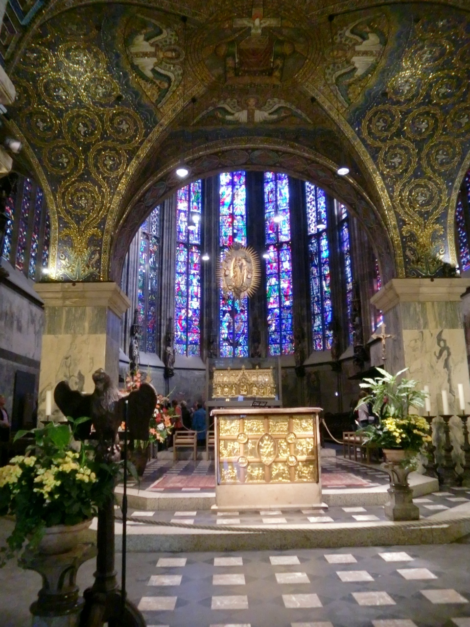 前置きが長くなりましたが、大聖堂自体は素晴らしく、古典主義様式・ビザンチン様式・ゲルマン・フランク様式など様々なヨーロッパ教会建築様式の融合が醸し出す独特の敬虔で壮麗な雰囲気に、圧倒されます。複数の様式が入り混じり、増改築を繰り返し、現在の姿に至っているため、どこか迷宮的で、アシンメトリー。複雑なドイツ中世の歴史を感じさせます。