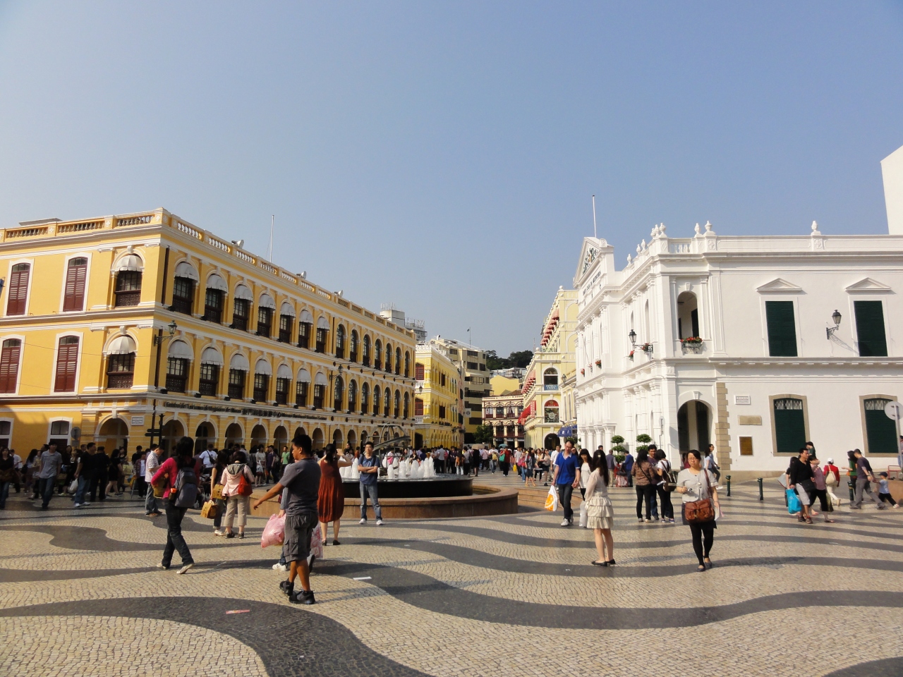 世界遺産の密集地でマカオ観光で必ず行くところです。外観しか見られず、閉鎖されている教会もありますが、殆どの建物が今も使われ、見学出来るようになっています。広場の石畳の模様は、ポルトガルと同じで黄色や白の建物を引き立たせています。