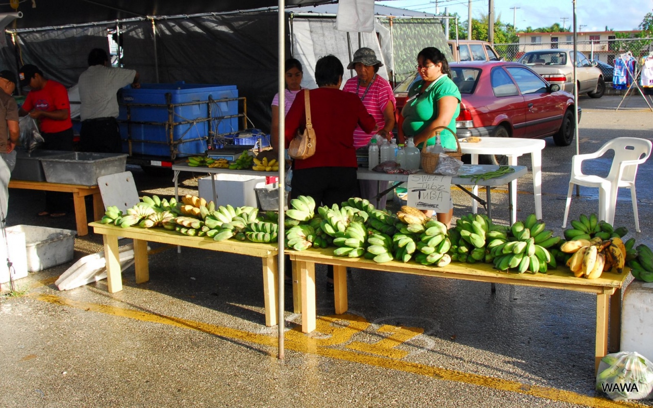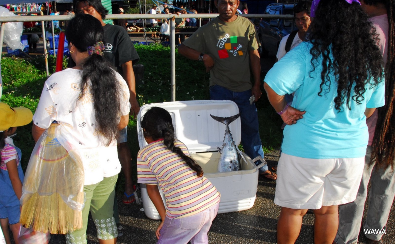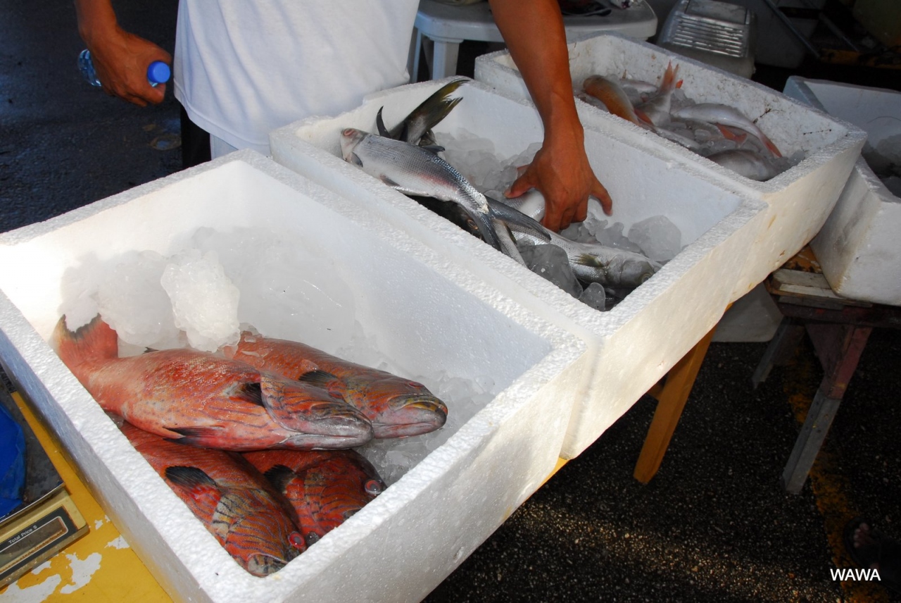 ここでは、鮮魚、野菜、洋服、工芸品、地元チャモロ料理の屋台など多くのお店が出店しています。Tシャツやアロハシャツ、パレオ(女性の腰巻布、水着や軽装の上から巻いたり羽織ったり温度調整に便利)などの衣料品の店が多いのですが、ロスドレスフォーレス(ローカルな衣料も有り)などの方が安かったので、初めて訪れた時以降は買ったことがありません。パリの蚤の市やアメリカのフリーマーケットのような掘出物期待ということでもありませんので、私は地元鮮魚、地元野菜、地元果物など他では見ることが出来ない地元生活密着型のお店を見たり写真に撮ったりすることで楽しんでいます。