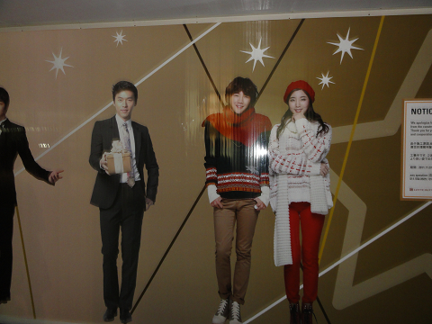 流行の韓国スターがエレベーター近くの壁でお出迎えしてくれました。入店記念品はJYJのクリアファイルでした。円高、ウォン安で買おうと思ってたクリームも安く買え、お得な気分になりました。成田で10%引きでも韓国の方が安かったです。