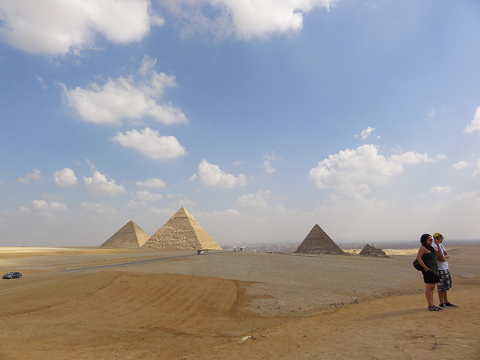 青い空の下、広がる砂漠の中に大きなピラミッドが並んでいます。TVで見た景色の中に自分が居る事に感動しました。