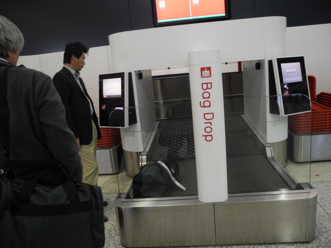 カンタス航空で、メルボルンからシドニーに移動です。ここメルボルン空港では、かなりの効率化で、自分でバッグのタグをつけたり、航空券を発券したりと色々、日本では、サービスしてもらっているのを自分自身でやるので、驚きです。