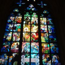 プラハ城に入って一番最初に見るのが聖ヴィート大聖堂。大聖堂の中には入れるが、ミュシャの絵を近くで見るにはチケットが必要。これはプラハカードにもついているので奥まで入れる。入口をはいって左側の手前から3番目がミュシャのステンドグラス。どれもステンドグラスは素晴らしい。
