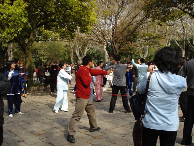 「中国の公園ではこんな事をしています」という利用方法を見に行った感じでした。朝から凄い賑わいで、中高年、障害者の方達の社交場でした。社交ダンスや太極拳、路上書道などグループに分かれて楽しんでいました。