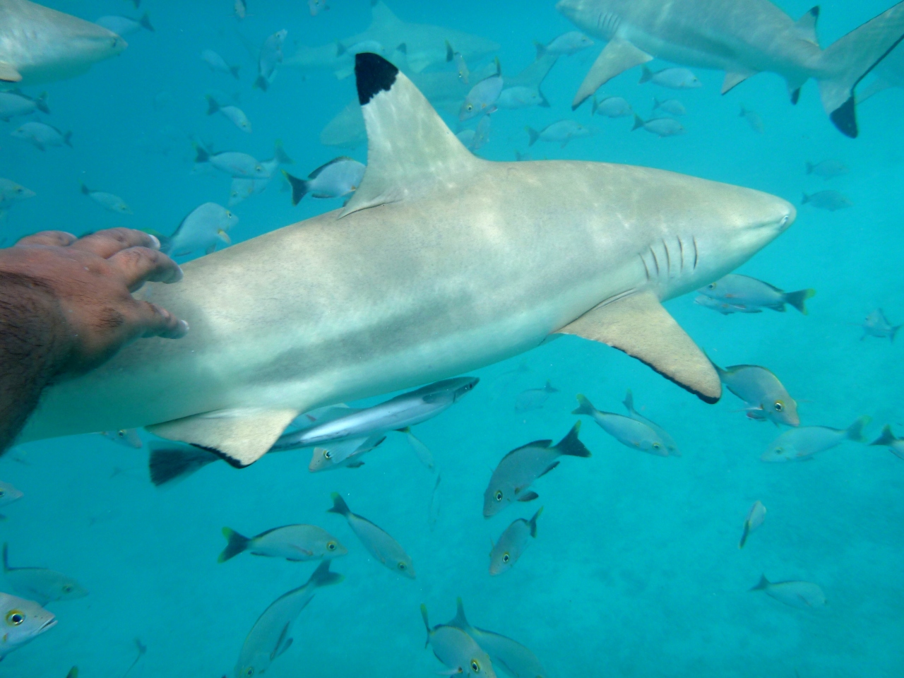 無人島での食事の後、島の少し沖合いでシャークフィーディングをしましたが、鮫の大きさもボラボラ島とは比較にならないくらいの大きさです。また、かなり近くまで来ますので、触ることもできました(本当に鮫肌です)。