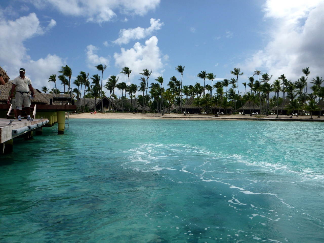 ランギロア島では幾つかアクティビティがありますが、観光客が少ない場所のため、参加が2組以上いないと催行されないものが多く、選択肢は限られてきます。その中でも人気なのが、ブルーラグーンへのピクニックです。ピクニックといっても、歩いていくのではなく、スピードボートで環礁内の無人島へと往復し、帰りにシャークフィーディングとシュノーケリングを楽しむという、丸一日がかりのツアーです。私たちが申し込んだ時は日本人6人、外国人4人の計10人での催行でした。