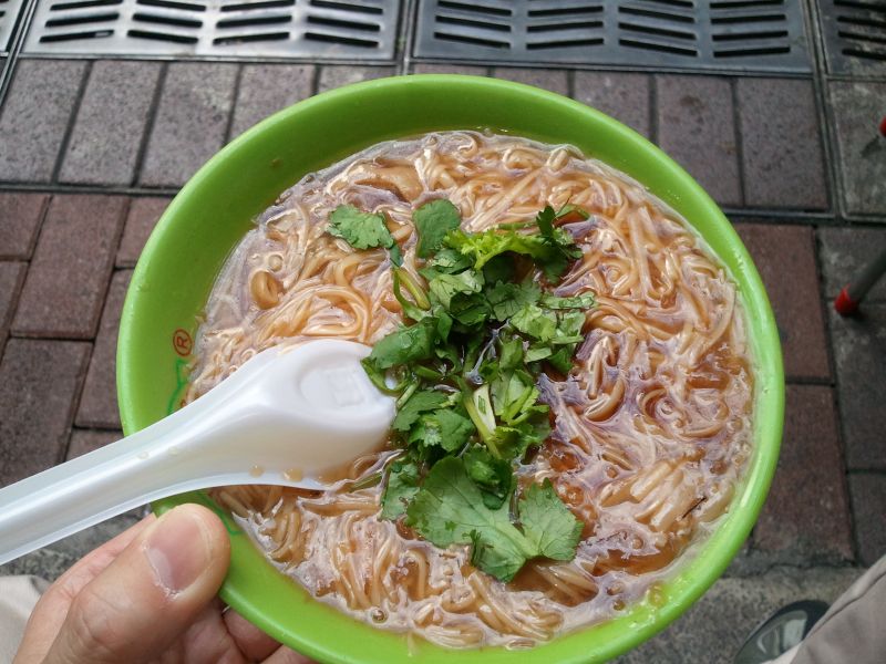 メニューは一つ(普通サイズと、小サイズ)しかなく、流れ作業でちゃかちゃかと作ってくれる感じ。それを、箸ではなく、なぜかスプーンで・・・。