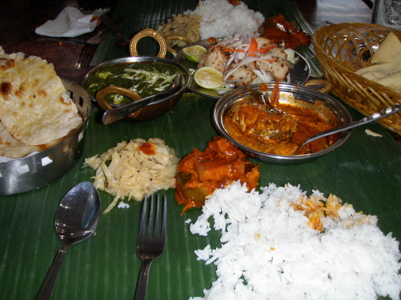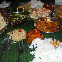 料理は、バナナの葉の上に盛られ、店員さんがライスをこまめに継ぎ足してくれるので、なかなか減りません。