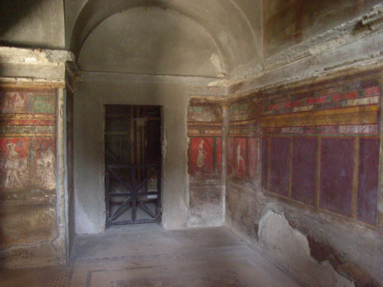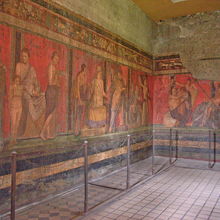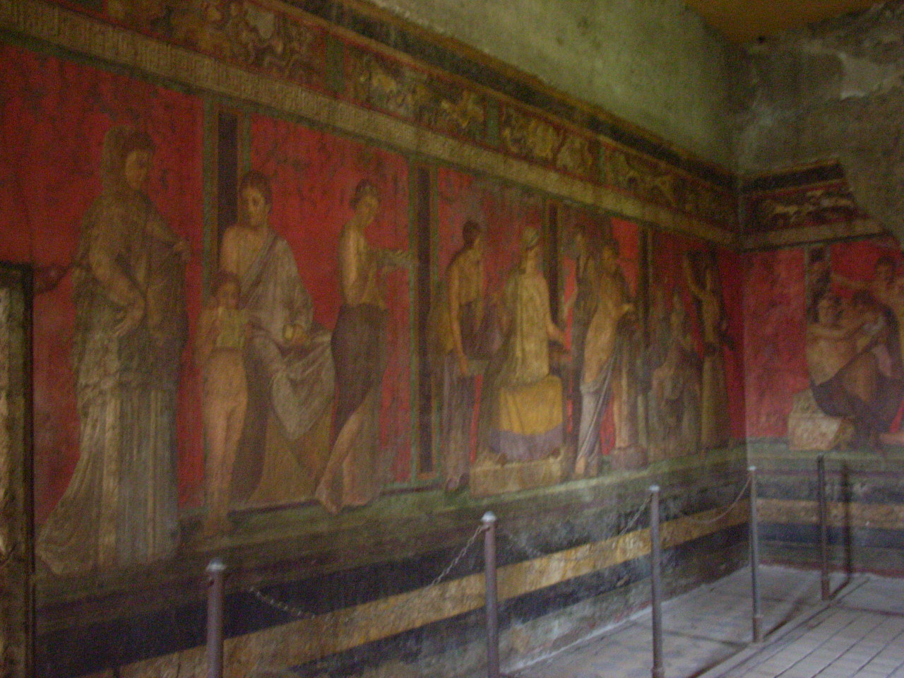 なぜ秘儀荘という名前がついたかというと、ポンペイが火山に埋もれた当時流行っていた宗教の遺跡で、その宗教儀式の一部始終を壁画が残されているからです。その儀式とは、酒の神を祭る儀式で、祭事の模様が順を追って描かれています。