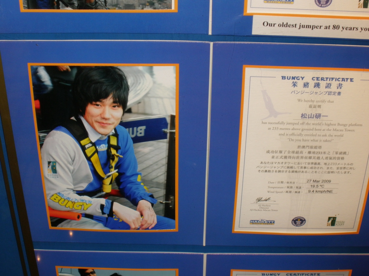 松山ケンイチさんがバンジージャンプをしたという認定書が飾ってあって、ちょっとしたフォトスポットになっていました。