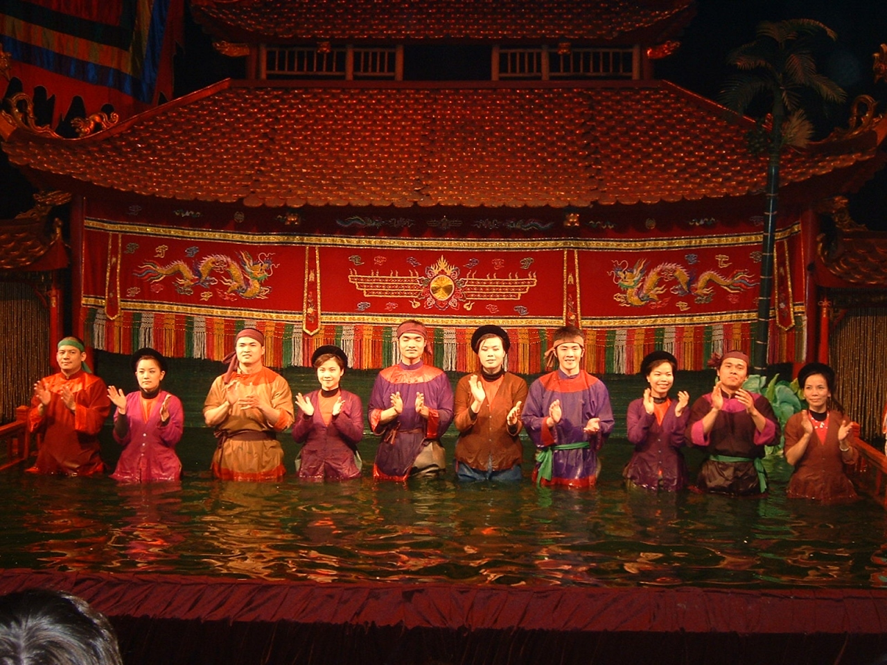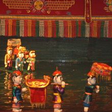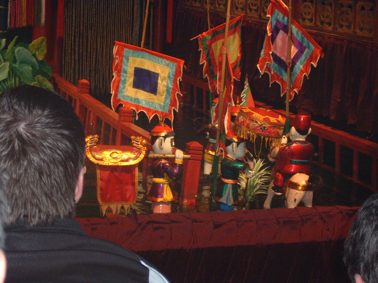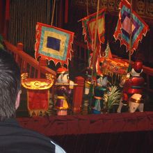座席はごく小規模な映画館のような作りです。正面に建物のセットがあり手前に緑色の水を湛えた池。左手に楽団が陣取っています。やがて、音楽が鳴り歌が始まります。すると、建物のセットから人形が現れます。水の上を右へ左へ何体も、船や魚も入り乱れ、クライマックスには花火がドンパチ。でも、話の筋は全くわかりません。最初は人形をどうやって動かしているのか不思議でしたが見ている内に解ってきます。池の水が緑色なのは着色しているんですね。