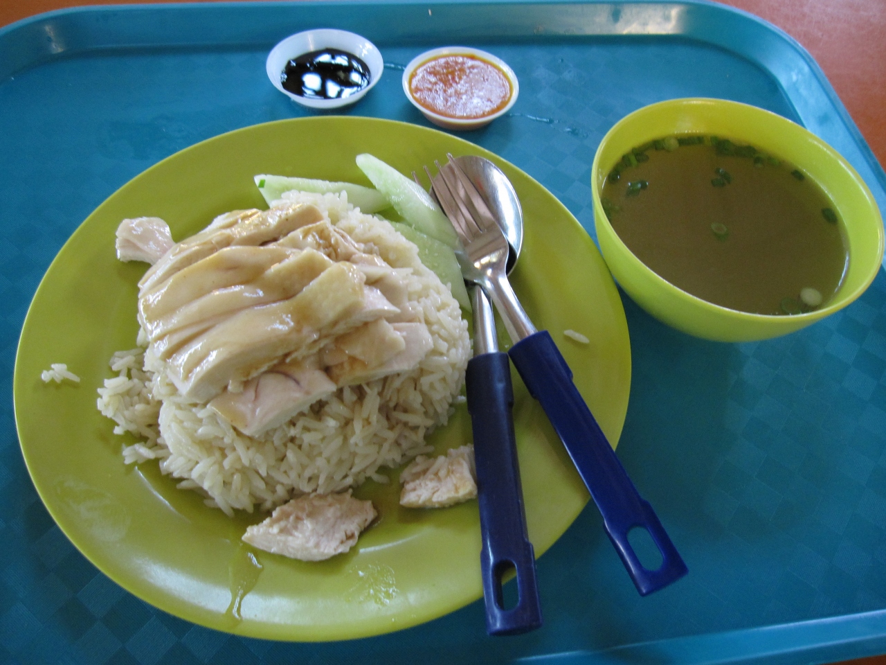 私は鶏をゆでたダシで炊かれたご飯の上にチキンを載せたものを