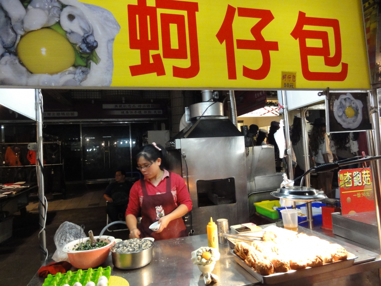 立多商旅(ベストホテル)からタクシーで7・8分位、105TWDで行けました。ぎっしり屋台が並んでいるのかと思ったら、ゆとりがある並び方、平日で人も少な目で歩きやすかったです。食べ物屋台が多く見るもの次々食べたくなりました。取りあえず、一口づつと士林でも食べた焼饅頭、ドラゴンフルーツの紅、牡蠣と卵の包み焼、物は試しの臭豆腐、愛玉水、衛生検査済みのアイスと従姉妹と試食三昧でした。