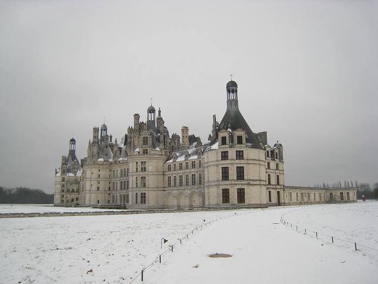 シャンボール城の周りには、雪がうっすら積もっていました。