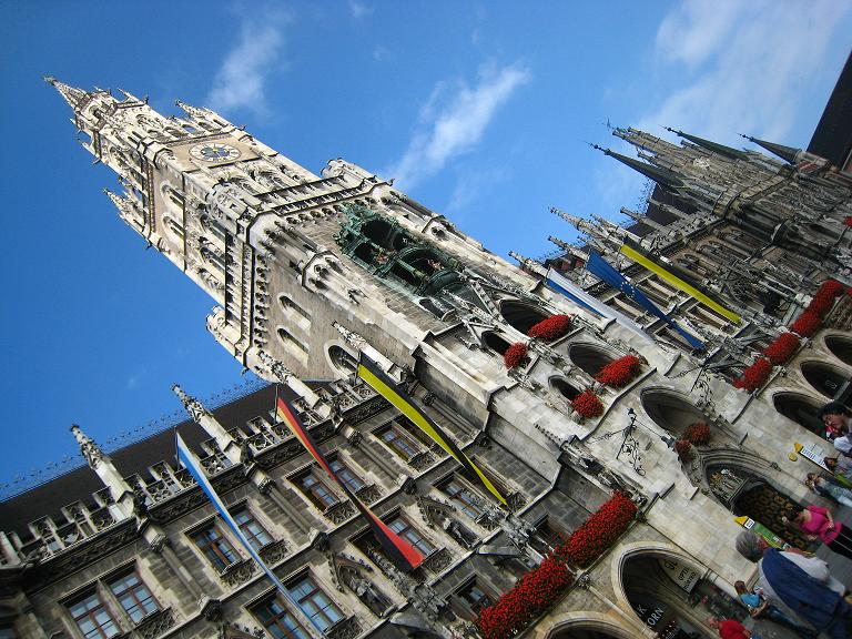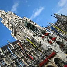 そこにあるネオ・ゴシック様式の新市庁舎ですが、鐘がゆっ~くり鳴り出すと、新市庁舎の塔の真ん中辺りにあるからくり時計が動き出します。
