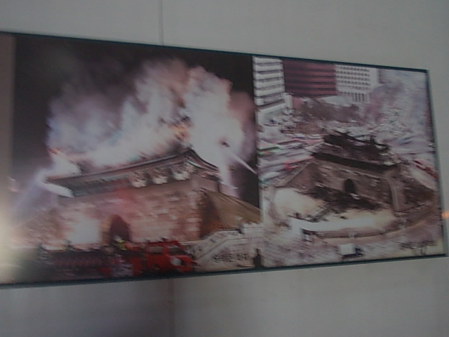 ここは、数年前の焼失によりすっかりと有名になってしまいましたが、2012年3月現在は、まだ工事中の様相で、外壁を工事資材で囲まれた状態ですので、新しくなる南大門を見るには、もう少し時間的猶予が必要だと思います。ただ、この工事中の外壁を利用して、その手前のエリアにて、南大門の歴史をパネルで紹介したりしていますので、これを見て回るのもお勧めです。中でも南大門が燃え盛る生々しい写真に衝撃を受けました。