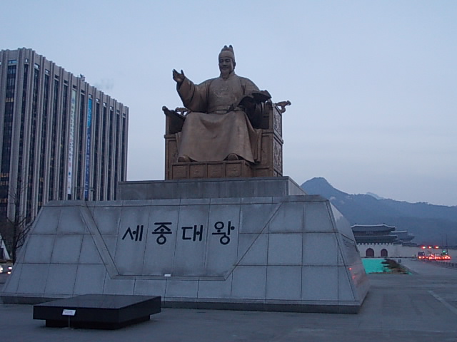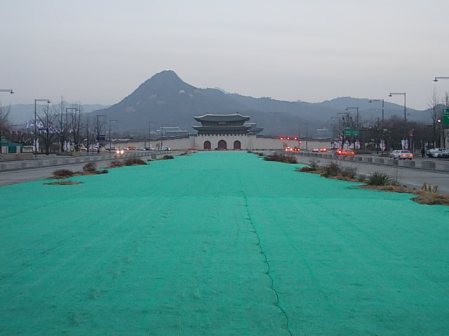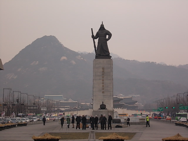 ソウル中心部の北部に位置する景福宮に至る南門にあたる光化門の前付近は、ソウルを代表する交通量の激しいエリアですが、広い道路ですので、真ん中が広場になっていて、歩行者が歩けるようになっています。南側から眺めると、北漢山をバックにこの門がとても立派に映えていて、ソウルを代表する風景だと思います。広場に関しては、悠々と歩けますが、広場にアクセスする際には、いくら距離があっても必ず信号を渡るようにして下さい。それを無視して渡ろうとするのは自殺行為になるほどの交通状況です。