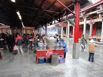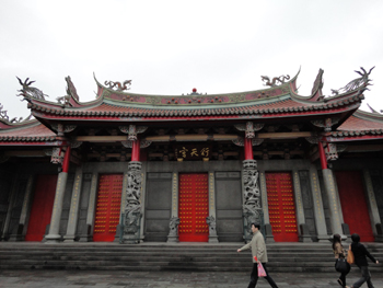 行天宮は駅から歩いて5分くらいのところにありました。中に入るとまず洗い場があり、お盆が沢山おいてあります。見ているとお盆の上に果物を乗せ、本堂の前で拝んでいます。中に入ると水色の服を着たボランティアの人たちが長い線香を配っています。私も1束もらってお祈りをしてきました。そして境内の箱に入っている三日月形の赤い木片(聖)を2つ取り、願い事をしながら聖を投げます。裏と表がでればOK。表と表はNO。裏と裏が出たときは神様に是非を問うような案件ではないと言うことらしい。