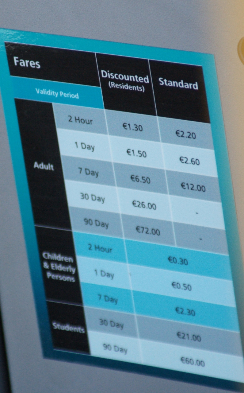 2時間券2.2ユーロ、1日券2.6ユーロなので、2時間を越える可能性があるなら、最初から1日券にしておいた方がいいと思います。