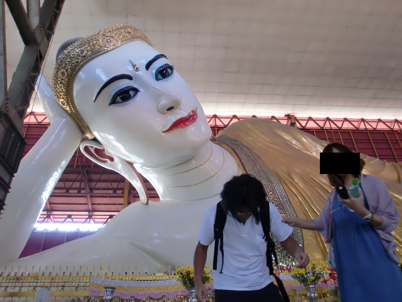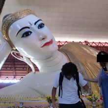この寺院の見物は何と言っても寝仏像です。かなり大きな寝仏像ですので見応えがあります。派手好きなミャンマーだけあって、この寝仏像は化粧が施されています。色の付いた仏像ってあまり見た事がないのでちょっと違和感がありました。