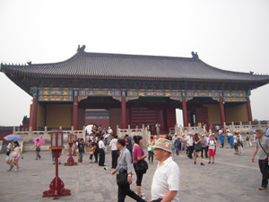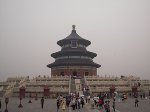 天壇公園は清王朝の皇帝が毎年天地の神を祀り、豊作を祈った場所だそうです。まず立ち寄ったのは天壇公園の近くにある掛け軸店。愛新覚羅溥傑(あいしんかくら ふけつ)の子孫だという老人が掛け軸を書いている。溥傑とは満州国最後の皇帝溥儀の弟。書家であり、流水の如き独特の書体は流麗で人気が高かったそうです。お値段もかなりのものでした。天壇公園も門をくぐるとまず目に入るのが祈年殿。釘を1本も使わず、28本の柱で支える構造です。中を見ようとしても人が多く、ゆっくり見ることができませんでした。