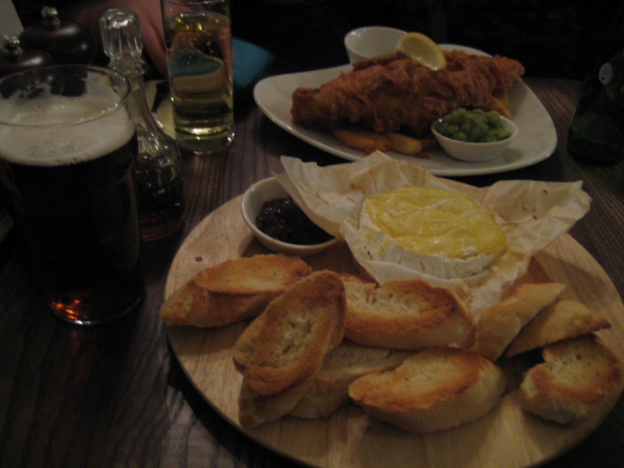 料理はいかにもイギリスチックなもので、多分量が多いだろうなと思ったら想像を超えた多さでした。フィッシュアンドチップスとつまみのつもりで焼きチーズを頼んだら、丸ごとカマンベールが出てきました。パンも山ほど…。日本だったら6分の1サイズが2個くらいですよね…。最後なにかの我慢大会のように無言で食しましたよ。