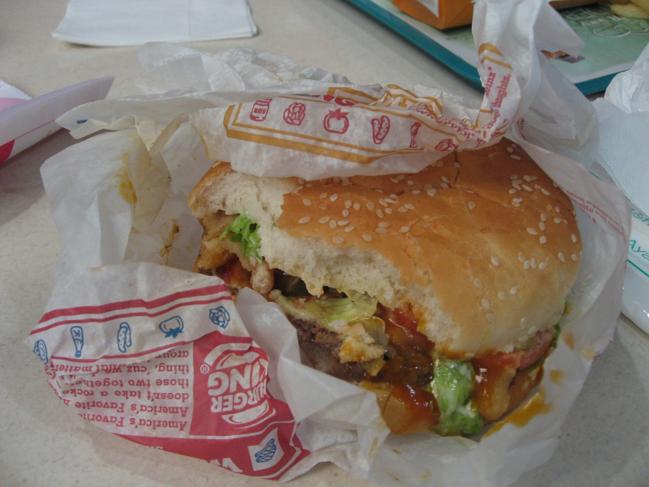 ワッパーを頼んだら、「何か変?」と感じました。レタスが入っていなかったのです。カウンターに行き、そのことを告げると「oh!sorry」と言って新しいものを作ってくれましたが、なんとまた野菜が入っていなかったのです。そしてまたカウンターへ。店のお姉さんは何度も謝ってくれました。そして、3回目にしてやっと本物のワッパーが食べられらわけです。作る人がいい加減なんだなと思いました。