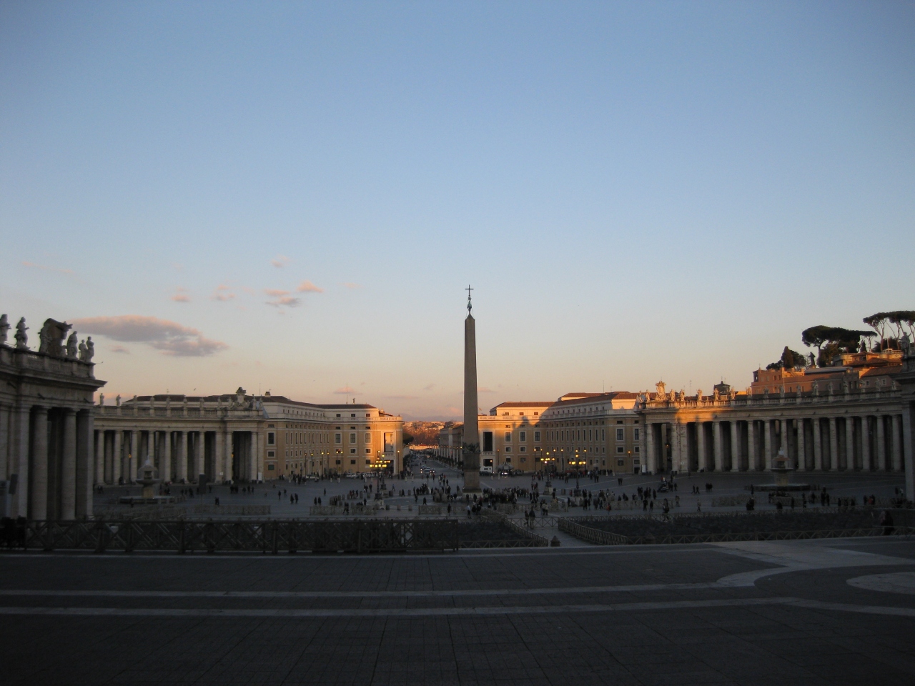 広場を囲む回廊には、4列に284本の円柱が並び、上には140体の聖人の彫刻があります。